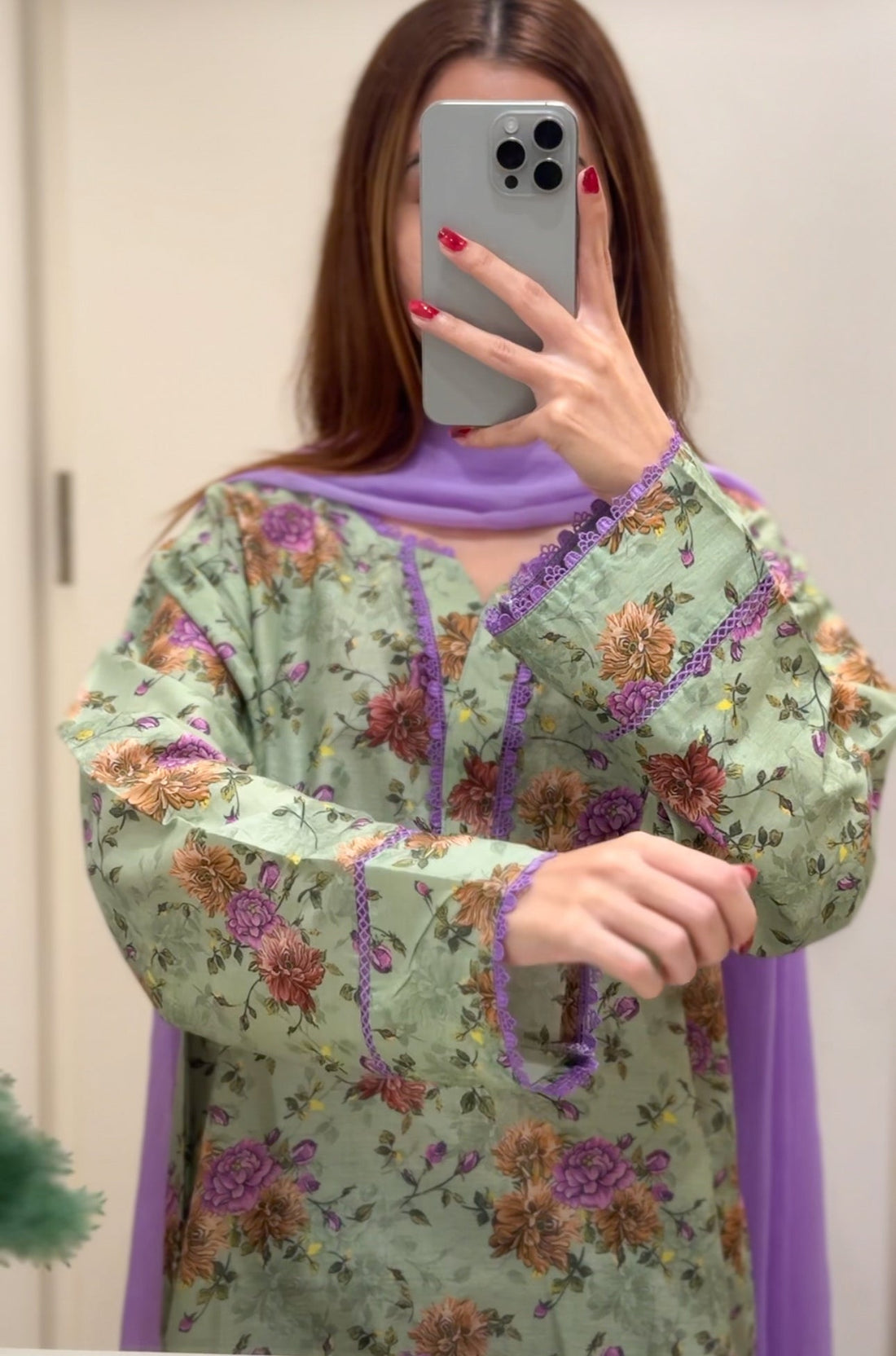 3-PIECE PRINTED STITCHED SUIT Shirt – Premium Lawn Printed Neckline and Sleeves detailing Shirt Plazo...