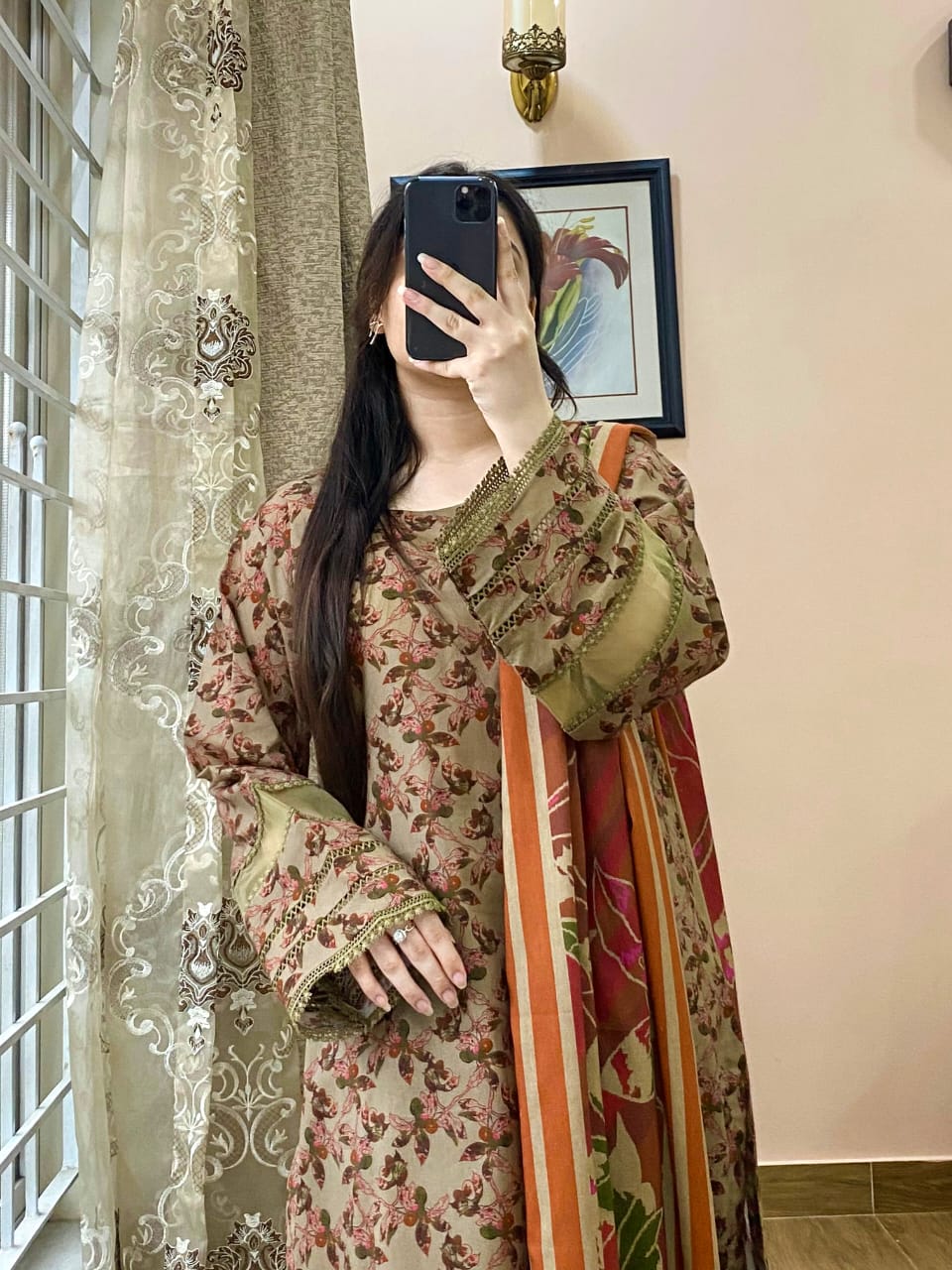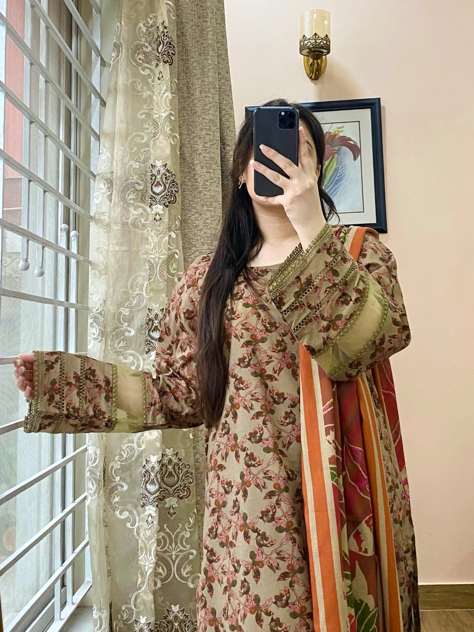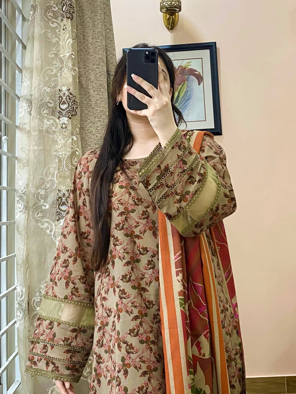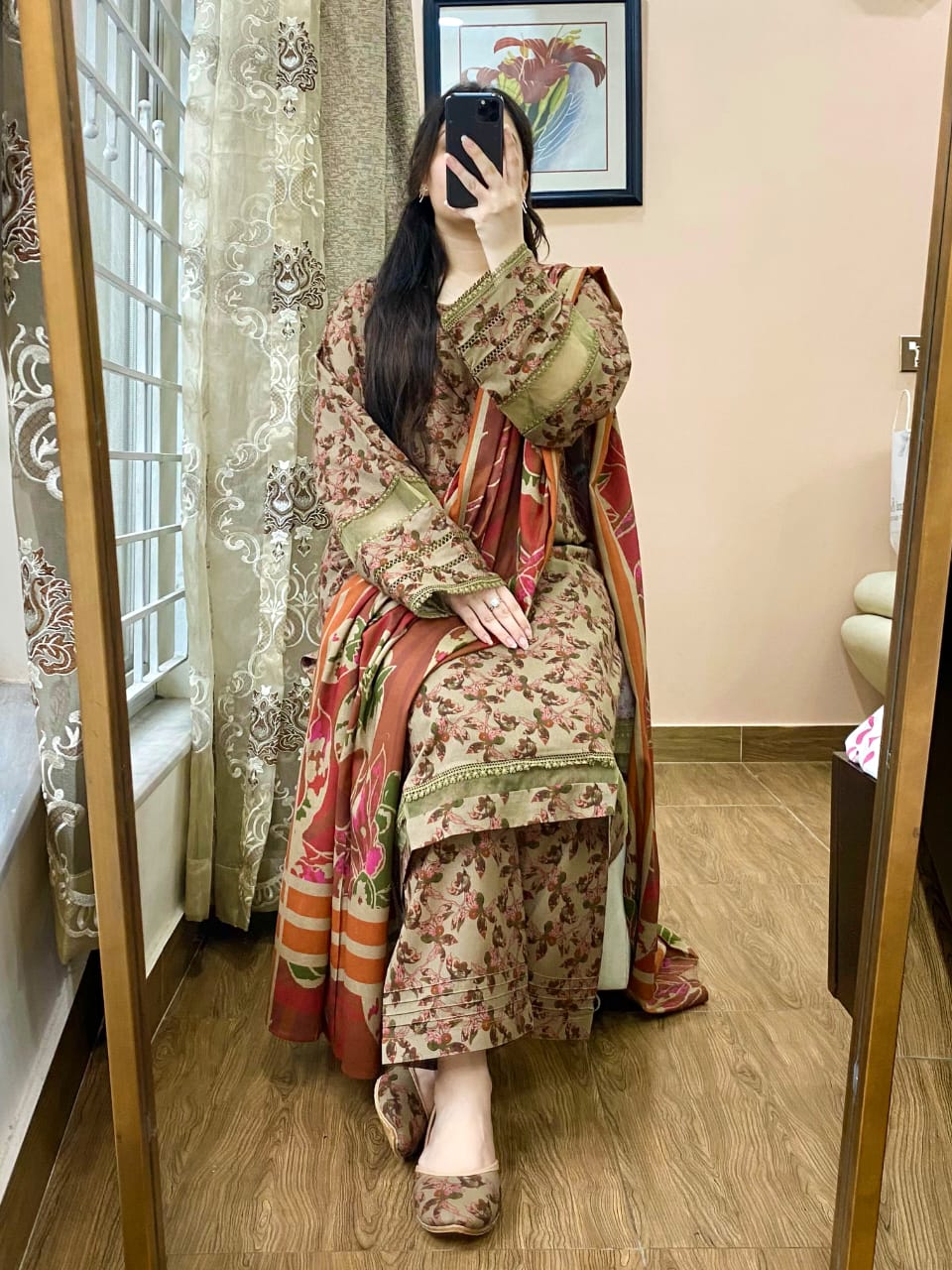 This premium shirt blends style with sophistication. Featuring a printed design, it includes intricate detailing on the neck and sleeves for a refined look. The classic round neckline is paired with lace embellishments on the sleeves. Fine tissue work adds a touch of elegance to both the sleeves and the center of the daman, creating a beautifully finished piece. Coordinated printed lawn shalwar with stylish pin-tucks detailing at the bottom, offering a graceful and structured finish. Matching printed lawn dupatta that completes the look with effortless charm.